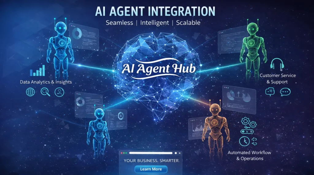 AI Agent Integration uses artificial intelligence to automate tasks, answer queries, analyze data, and support business operations intelligently.